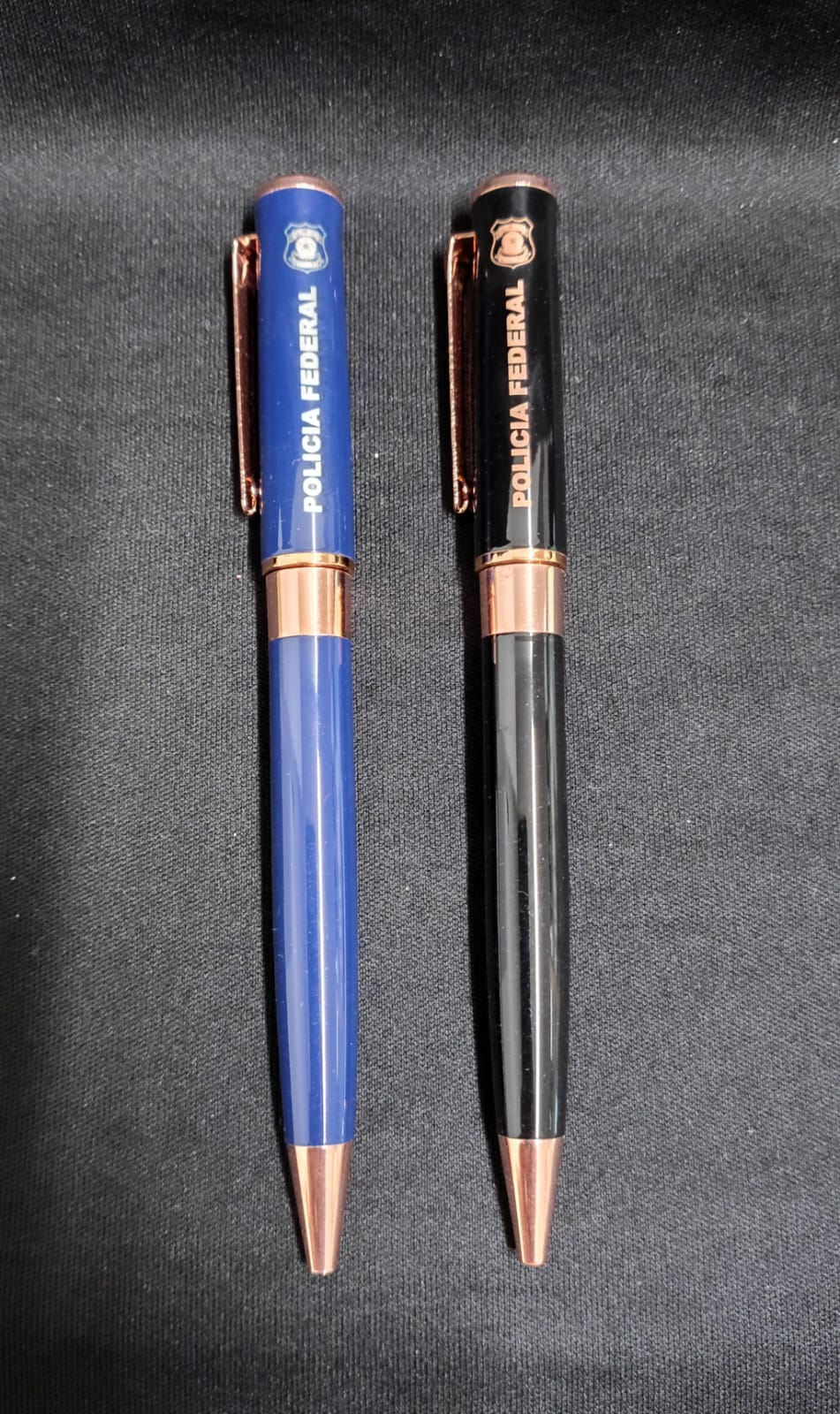 Caneta metal personalizada, nas cores azul e preta.