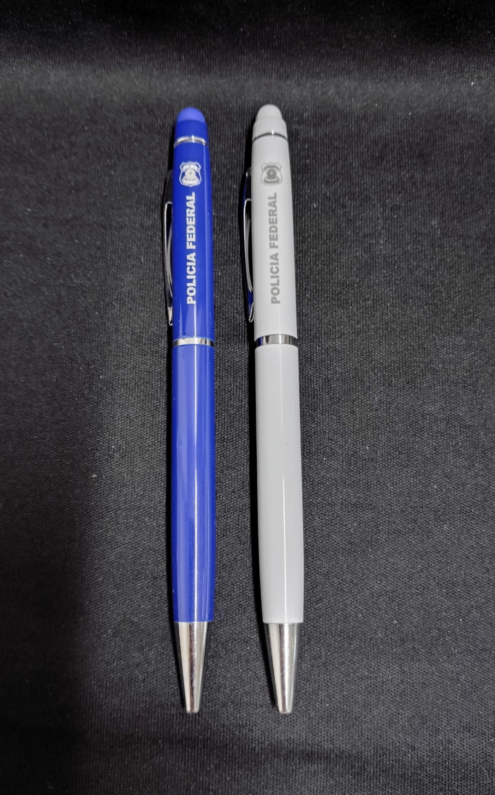 Caneta metal touch personalizada, nas cores azul e branca.