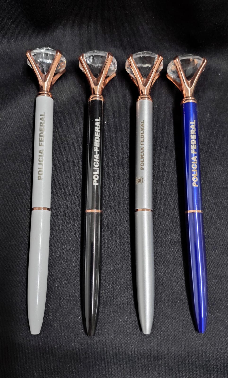 Canetas esferográficas na cores preta, branco, azul e cinza.